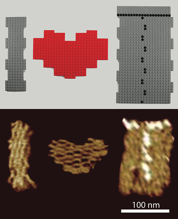 图:上部和下部分别为乐高积木搭成的结构模型和原子力显微镜下看到的DNA纳米结构“I”“