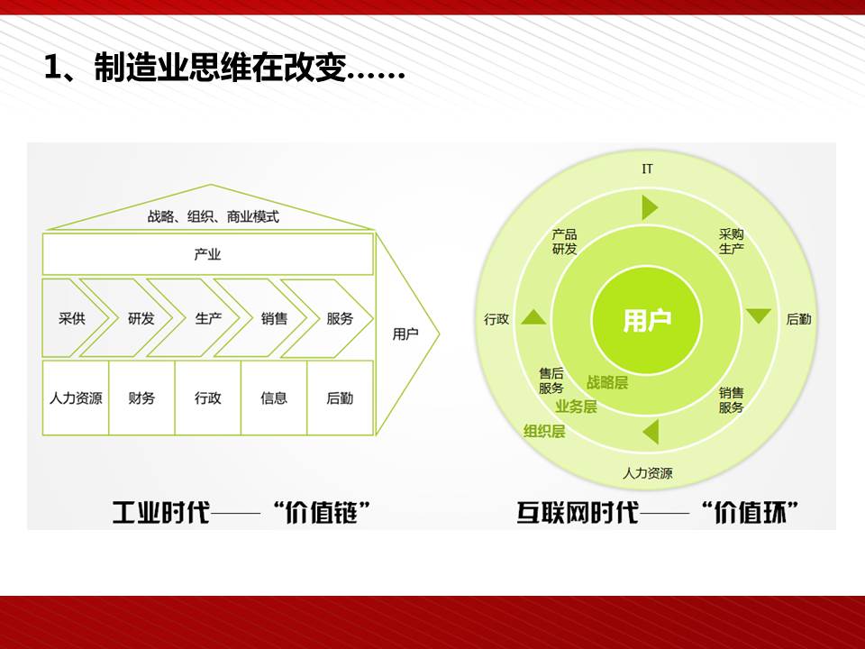 改变了制造业的思维,传统制造业以产品为中心,靠传统的分工合作、部门合作,未来因为有互联网为驱动,互联网时时协同,可以通过网络,根据客户的要求定制化、个性化的要求,通过网络以客户为中心,满足客户定制化、个性化的需求,进行部门制或者项目制的协同的发展,这是制造业思维的转变。