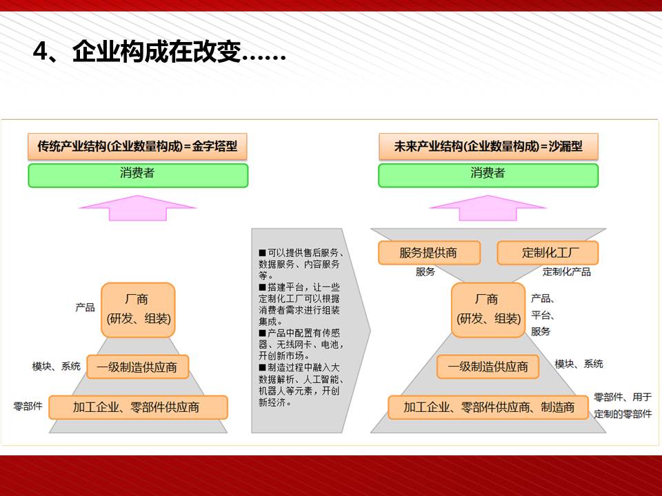 企业构成的改变,产业结构或者企业的规模、数量,未来在新工业革命到来时会发生改变,以前是金字塔形,未来因为制造业模式都是合作生产,合作消费,现在就要变成一个沙漏形的产业结构,未来可能会诞生新的行业、企业,厂商的上边又出现了更多的服务提供商,提供更多的生产性服务或者是服务性制造业。还有一些在厂商之上会生成很多的定制化的工厂,定制化的服务,这样一来大的企业可能主要精力放在研发、组装、打品牌,让新的企业进入,这些新行业、新企业的出现注入了新经济的发展。