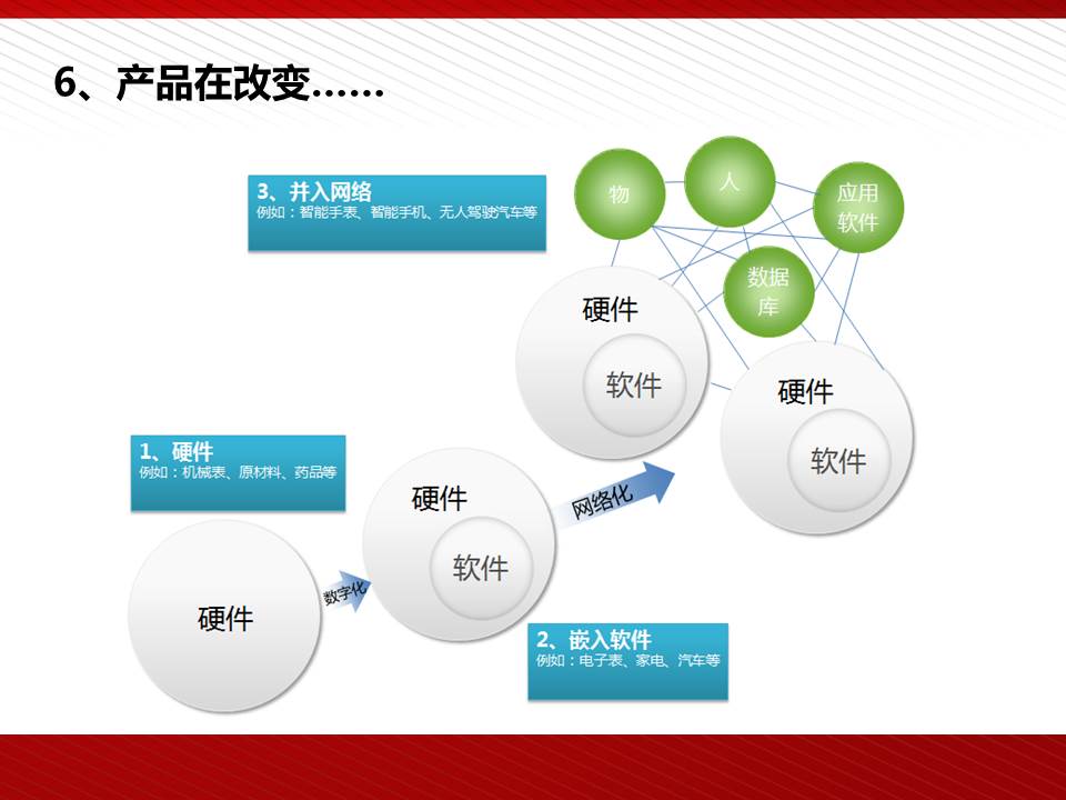 最后一个是,新工业革命不仅仅体现在生产上,生产角度上是智能制造,产品就是智能产品的出现,未来新经济的企业,肯定都要生产新的产品,新工业革命带来的变化,传统的工业革命只是生产硬件,后来硬件渐渐数字化,因为硬件里面都嵌入很多软件,未来应该变成网络化,产品网络化跟智能化是必然的趋势,现在智能手机、智能手表,国外有智能沙发,智能机床等等,会形成一个生态,形成一个产业链,像分享经济里面一个智能的移动终端。比如日本6年前就搞过一个“新一代汽车战略”,前瞻性的把汽车重新定义一下,汽车以后不叫汽车,车联网里面移动的终端,也说明一个问题,新工业革命到来时这个产品的网络化、智能化是必然的趋势,新经济,新工业企业也要这么考虑,怎么把产品进一步网络化、智能化,进一步形成自己的生态体系。
