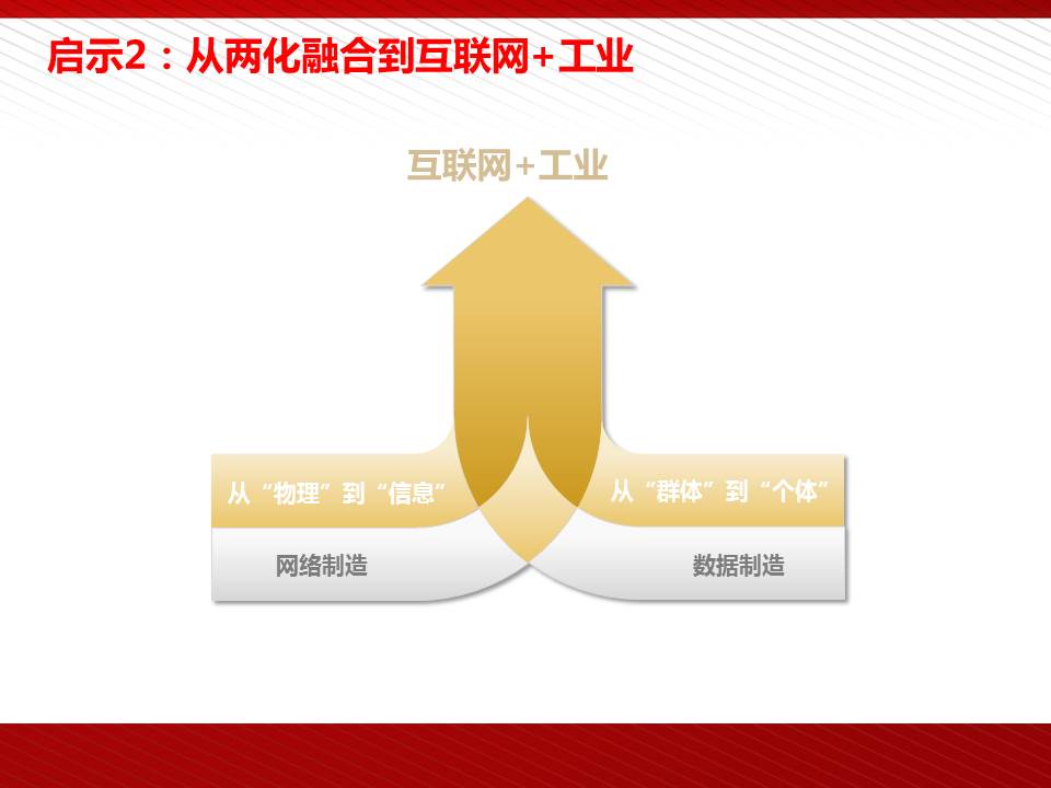 未来工业怎么办,以前工业工信部讲两化融合,未来应该是两化融合进一步发展成互联网+工业,互联网+制造业,从产品角度来看,从物理到软件,物理到信息,不是生产一个硬件的产品,不是卖产品,卖的是软件、服务和解决方案。从产品角度来看,不是面向群体大规模生产而是面向个体搞定制化生产。