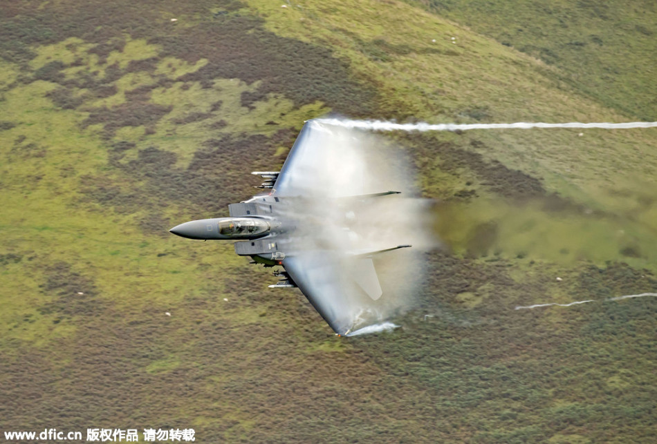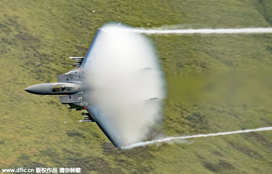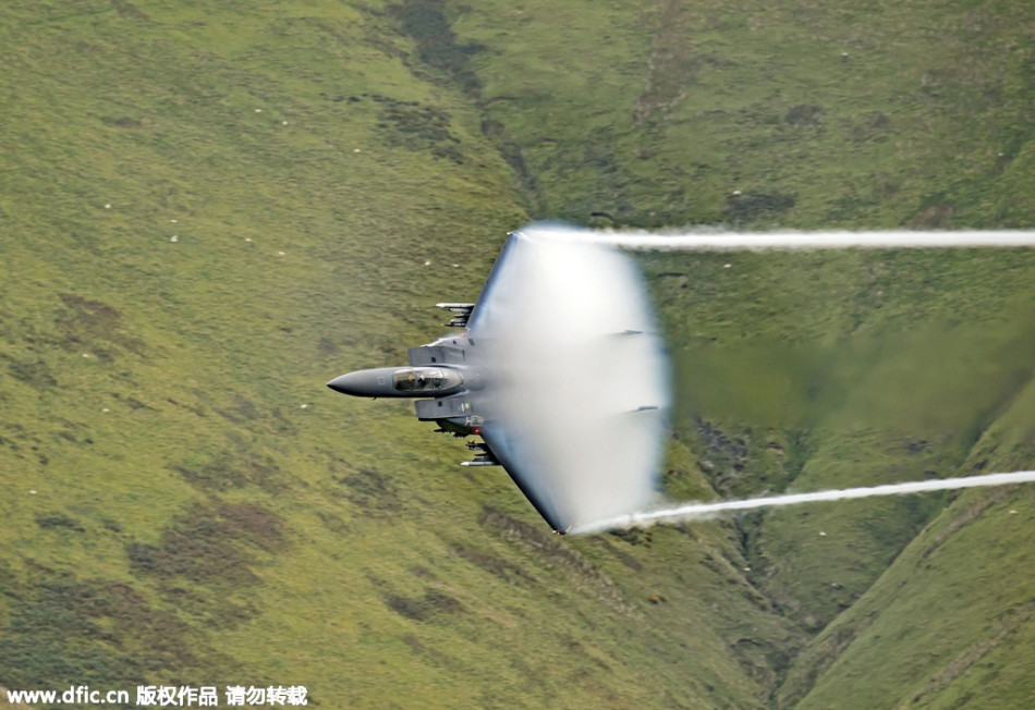 下面这些令人震撼的照片是由自由摄影师Bob Sharples在威尔士雪墩山国家公园拍摄的。几架低空飞行的战斗机正从风景如画的南威尔士山谷上空掠过,在留下两长条飞机云的同时,甚至产生了传说中的“音爆云”。