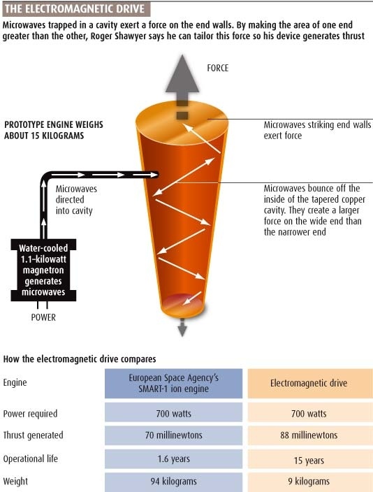 美国航空航天局(NASA)说,“不可能”的无燃料推进 EM引擎虽然打破物理学定律,但证实可以产生推力。若用于飞船,其速度之快可在10周内到达火星。