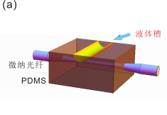 使用长度约3 cm的氧化硅微纳光纤嵌入固化的透明高分子材料PDMS中(折射率n=1.402),在微纳光纤上方制作一个直径约3 mm的半圆柱形微槽用于通过被测液体,微槽和微纳光纤间距约几微米到几十微米。在微纳光纤的一端通入1.55 mm波长的探测光,测量另一端的输出功率。