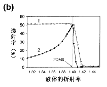 由于微纳光纤的倏逝场有一部分进入到半圆形液体槽中,当液体槽中的折射率改变时,输出端的透射率发生变化,如图12 b所示。图中曲线1 和2对应的氧化硅微纳光纤直径分别为1.6 mm和700 nm。对于较粗的微纳光纤 (曲线1,直径1.6 mm),由于倏逝场较弱,所以当液体折射率小于PDMS的折射率时,透射率与液体折射率无关;只有当液体折射率大于PDMS的折射率时,透射率才迅速减小。对于较细的微纳光纤(曲线2,直径700 nm),由于倏逝场较强,有部分进入到液体槽中,当液体折射率小于PDMS的折射率时,透射率随着液体折射率缓慢增加;当液体折射率大于PDMS的折射率时,透射率迅速减小,折射率传感的精度约为Δn=5×10-4。