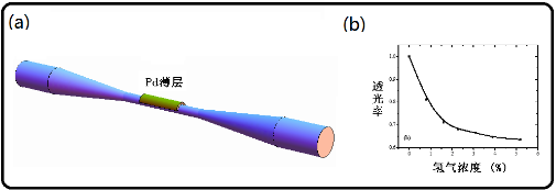 图13 (a) 表面沉积有Pd膜层的微纳光纤氢气传感器;(b)传感器对不同氢气浓度的响应[79]。